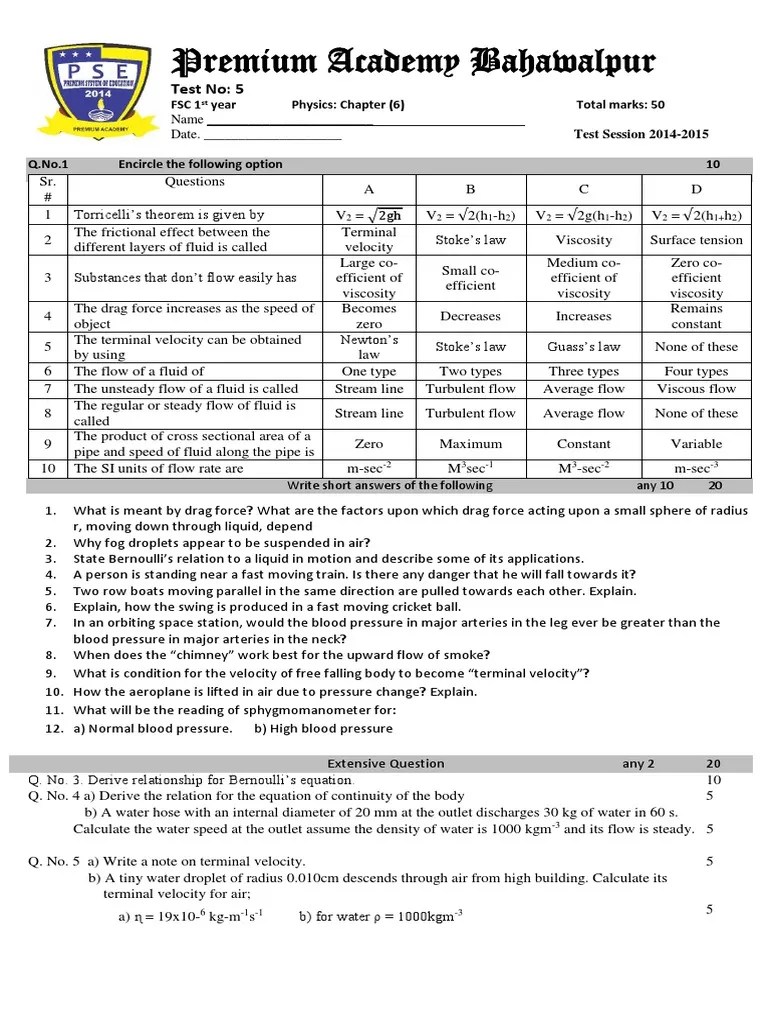 FSC Physics Test No 5. CH 6 Ind Year Drag (Physics) Fluid Dynamics