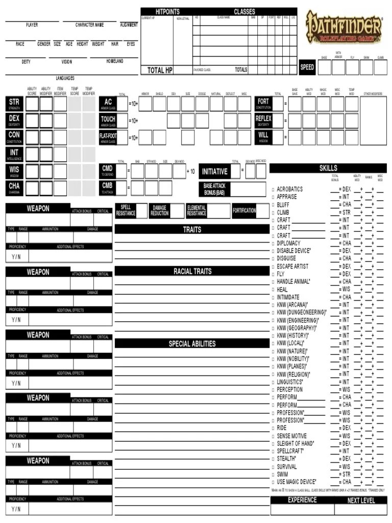 Pathfinder Character Sheet Printable