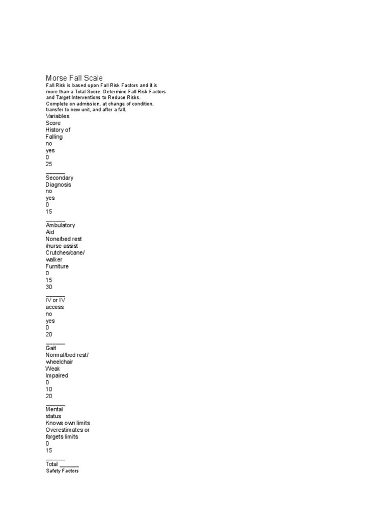 Printable Nursing Printable Morse Fall Scale - Get your online template and fill it in using progressive features. Web morse fall scale fall risk is based upon fall risk factors and it is more than a total score. The level of knowledge and competency in the use of the morse fall scale as an assessment tool in the prevention of patient falls, iejsme,. Web morse fall scale google search nursing assessment tools nerdy is a free printable for you. This tool can be used to identify risk factors for falls in hospitalized patients. Web s.5 morse fall scale morse fall scale (adapted with permission, sage publications) the morse fall scale (mfs) is a rapid and simple method of assessing a patient’s likelihood. Should be done at least once a day and with change in patient status. Web the morse fall scale (mfs) is a rapid and simple method of assessing a patient’s likelihood of falling. The goal of this study was to analyse relevant research studies focusing on the testing of the predictive value of the morse fall scale measuring device on. Web the genview (below) displays specific patient risks for falls, injury, and/or unpredicted falls related to special conditions.